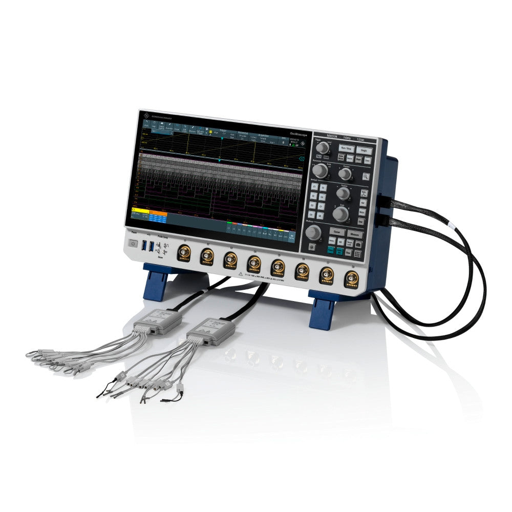 Rohde & Schwarz MXO38-5PK is a 12-bit oscilloscope with 500 MHz bandwidth, 8 analog channels and 16 digital channels (optional logic probes), 11.6" Full HD touchscreen, sampling rate up to 5 GSa/s, and standard memory of 125 million points.